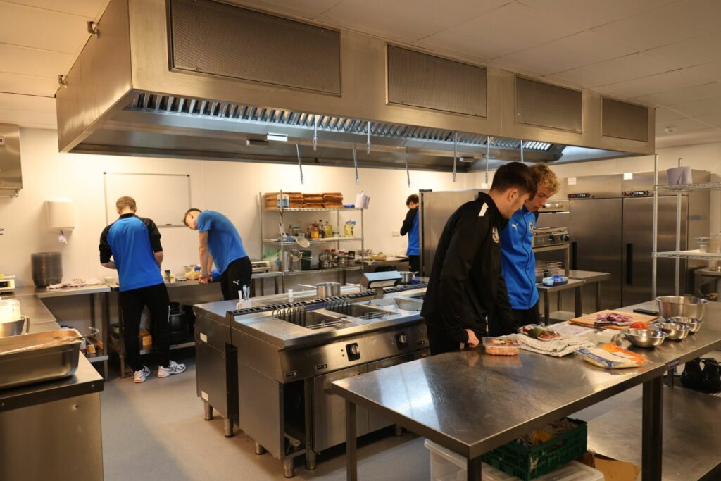 Each group were given a certain dish to make, with step by step instructions provided. For Ben Lomax and Dan Mahaffy, it was charred corn, feta and spicy king prawn conchiglie. Callum Besford and Braden Webb on the next team were tasked with a creamy pesto and pea pasta, whilst due to odd numbers, Aaron Davies was in a team of one and the goalkeeper’s allocated dish was sweet and smoky BBQ fajitas.